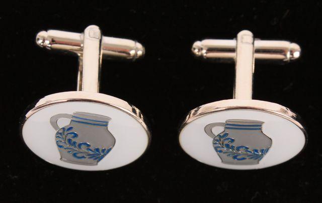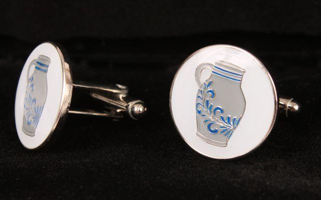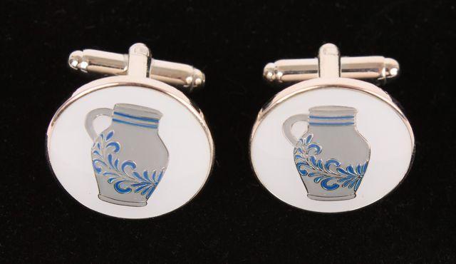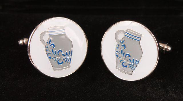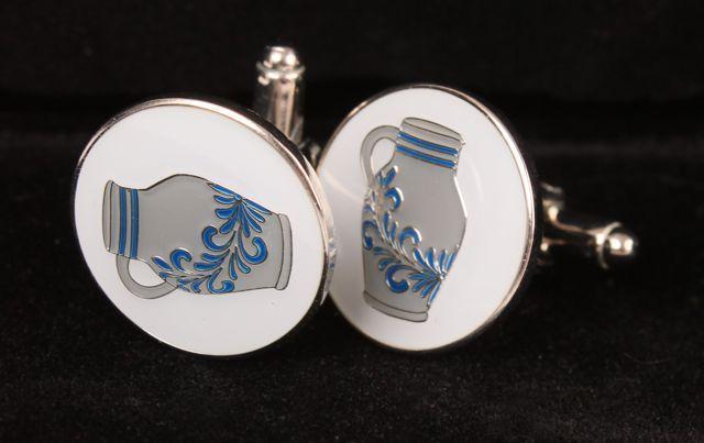 Wir haben jetzt sehr schmucke Manschettenknöpfe mit Bembelmotiv in zwei verschiedenen Versionen, einmal klassisch weiß-blau-grau auf silbernem Manschettenknopf und etwas knalliger auf kräftigem blauen Hintergrund.