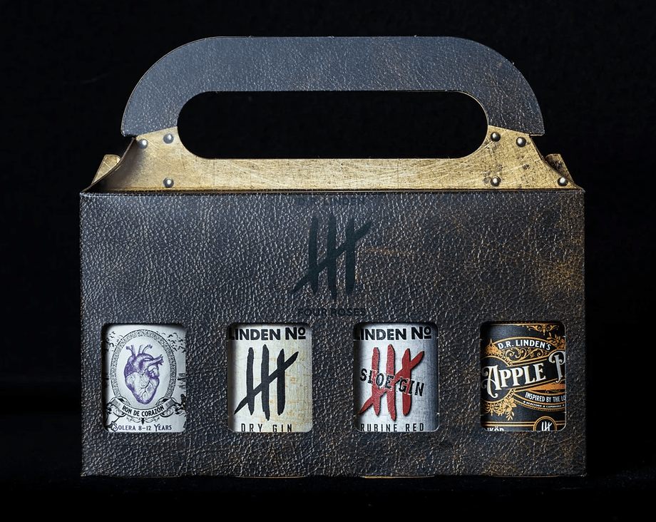 Der Apothekerkoffer von D.R. Linden beinhaltet den Linden No.4 Dry Gin, den Linden No. 4 Sloe Gin, D.R. Linden´s Apple Pie (Apfel-Zimt-Likör) und D.R. Linden´s Ron de Corazon.