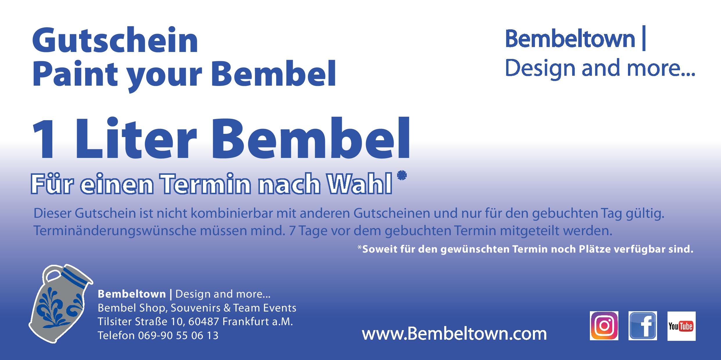 Mit diesem Geschenkgutschein triffst Du voll ins Schwarze. Die „Bembel Mal-Party“ ist nicht nur einfach ein Gutschein für einen Keramikkrug, sondern wie der Name schon sagt, kann der Bembel nach Herzenslust selbst bemalt werden. Du suchst lediglich die Größe des Krugs für deinen Beschenkten aus und wir machen den Rest. Wir haben 0,5 Liter, 1 Liter und 2 Liter Bembel im Sortiment, also für jeden Wunsch was dabei. Damit triffst du auf jeden Fall genau den Geschmack deines Geschenkempfängers.