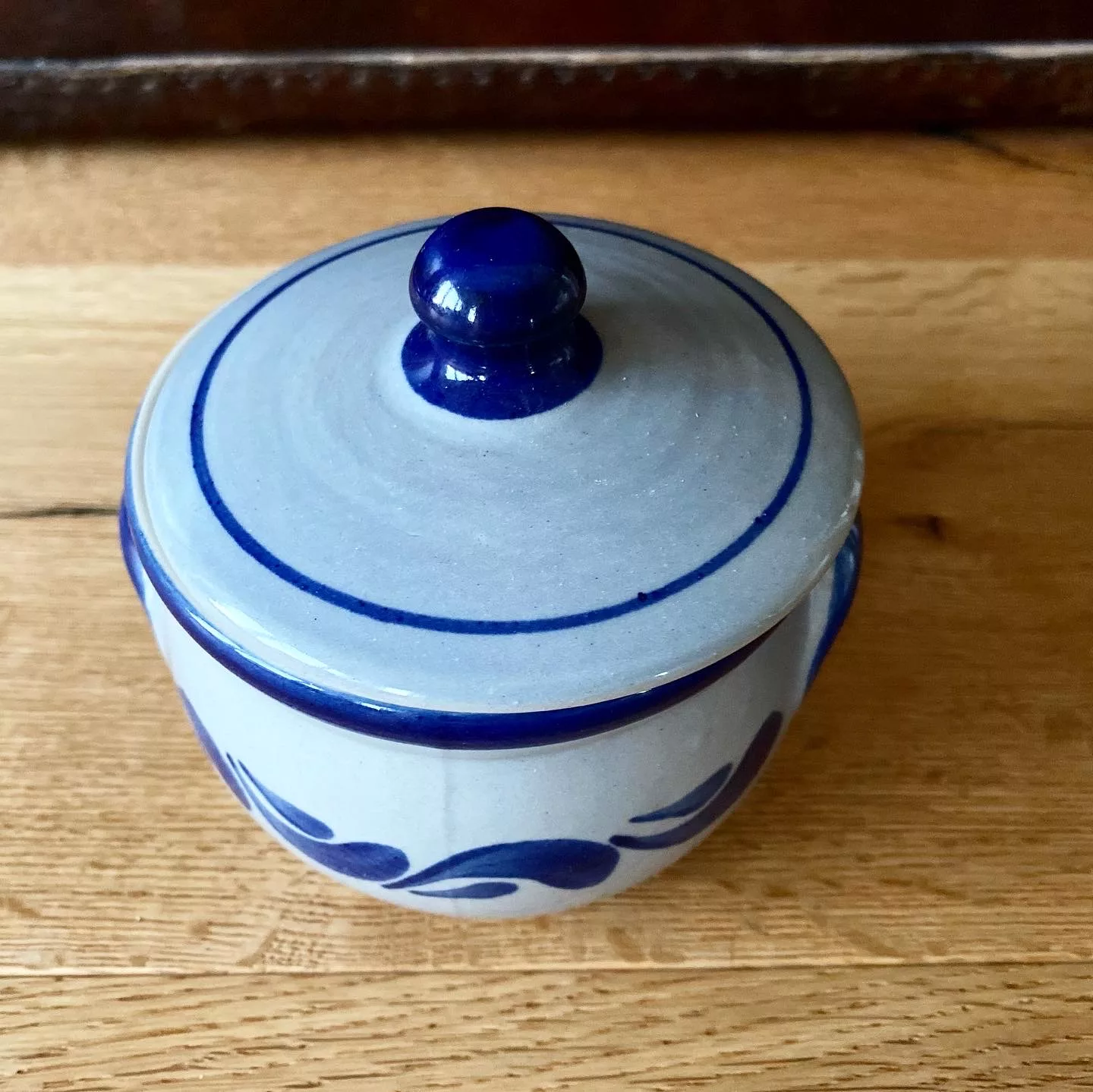 Unsere feinen Frankfurter Handkäs Dippe aus Steinzeug mit traditioneller Malerei Bembelschwung (Handarbeit) und lebensmittelechter Glasur.