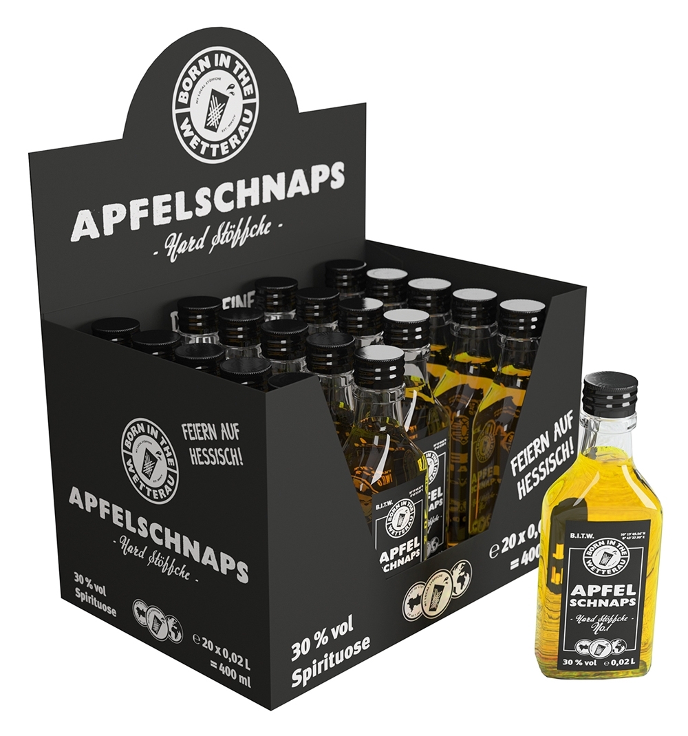 Ein 2 cl Apfelschnaps Fläschchen ist genau die richtige Größe, wenn man einfach nur mal wissen möchte, wie lecker das Hard Stöffche so schmeckt. Der BORN IN THE WETTERAU Apfelschnaps wird aus Wetterauer Apfelwein gebrannt und in Eichenfässern gelagert. Er ist bernsteinfarben, schmeckt leicht cremig und hat dabei eine starke, ehrliche Frucht.