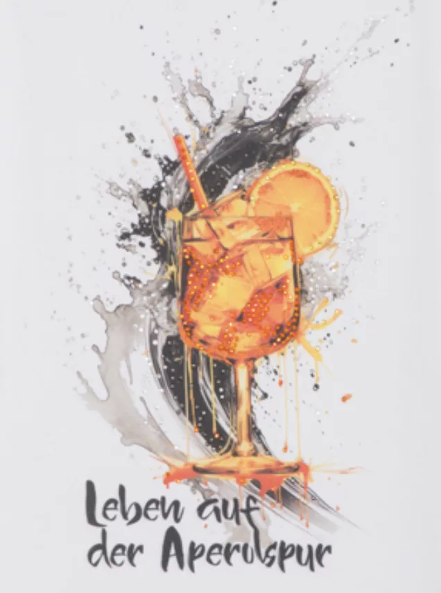 Das ultimative Lifestyle und Party Shirt für alle die das Leben auf der Aperolspur lieben oder gerne ein auffälliges T-Shirt tragen. Weißes Baumwollshirt mit farbigem Druck und Straßsteinchen – Bling Bling.